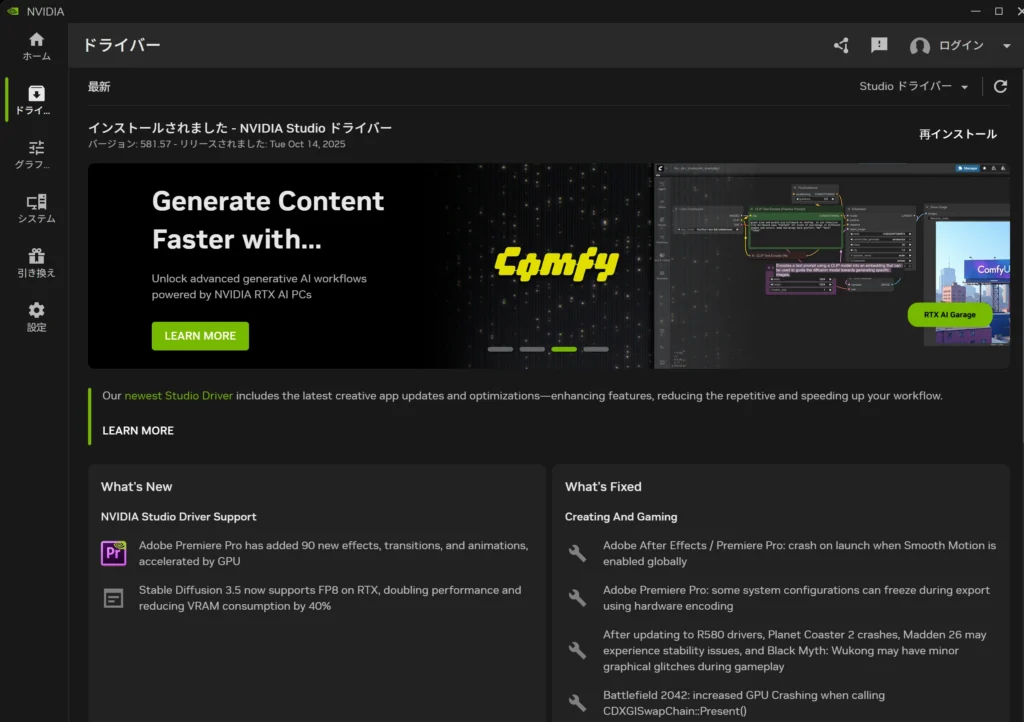 NVIDIA Studio認定PCは、クリエイティブ作業に最適化されているのが特徴。NVIDIA Studioドライバがプリインストールされていて、Adobe Premierなどの主要なアプリがスムーズに動作するのが魅力的です。