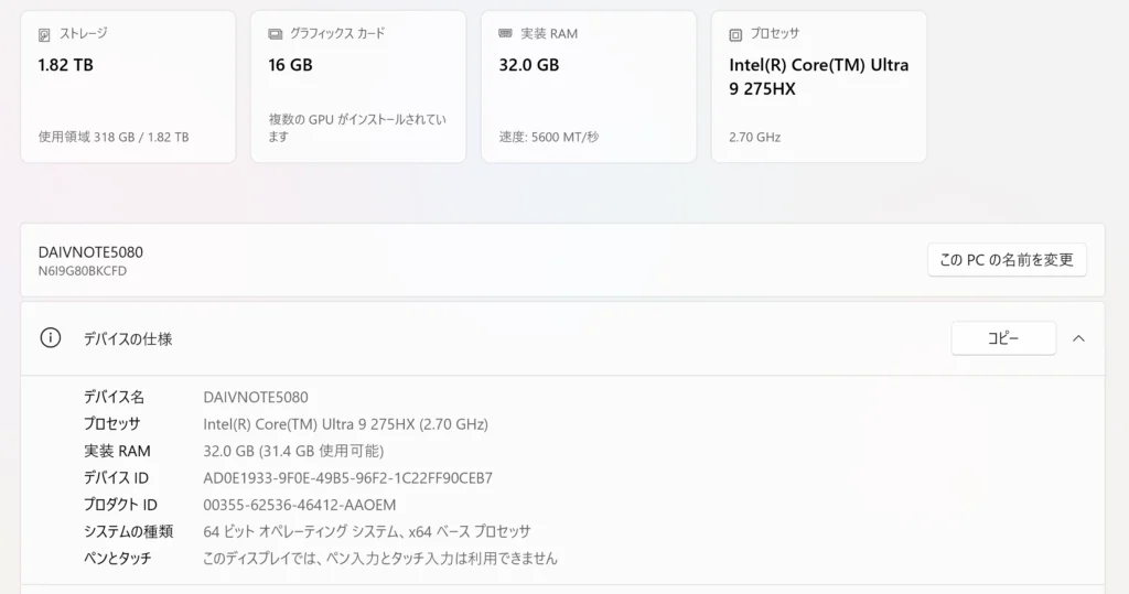 - CPU:Intel Core Ultra 9 プロセッサー 275HX