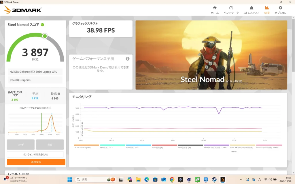3DMark Steel Nomad は、DirectX 12世代の 描画処理の持続力 を見るベンチマークです。一時的な高クロックではなく、安定した描画能力 が評価されます。
