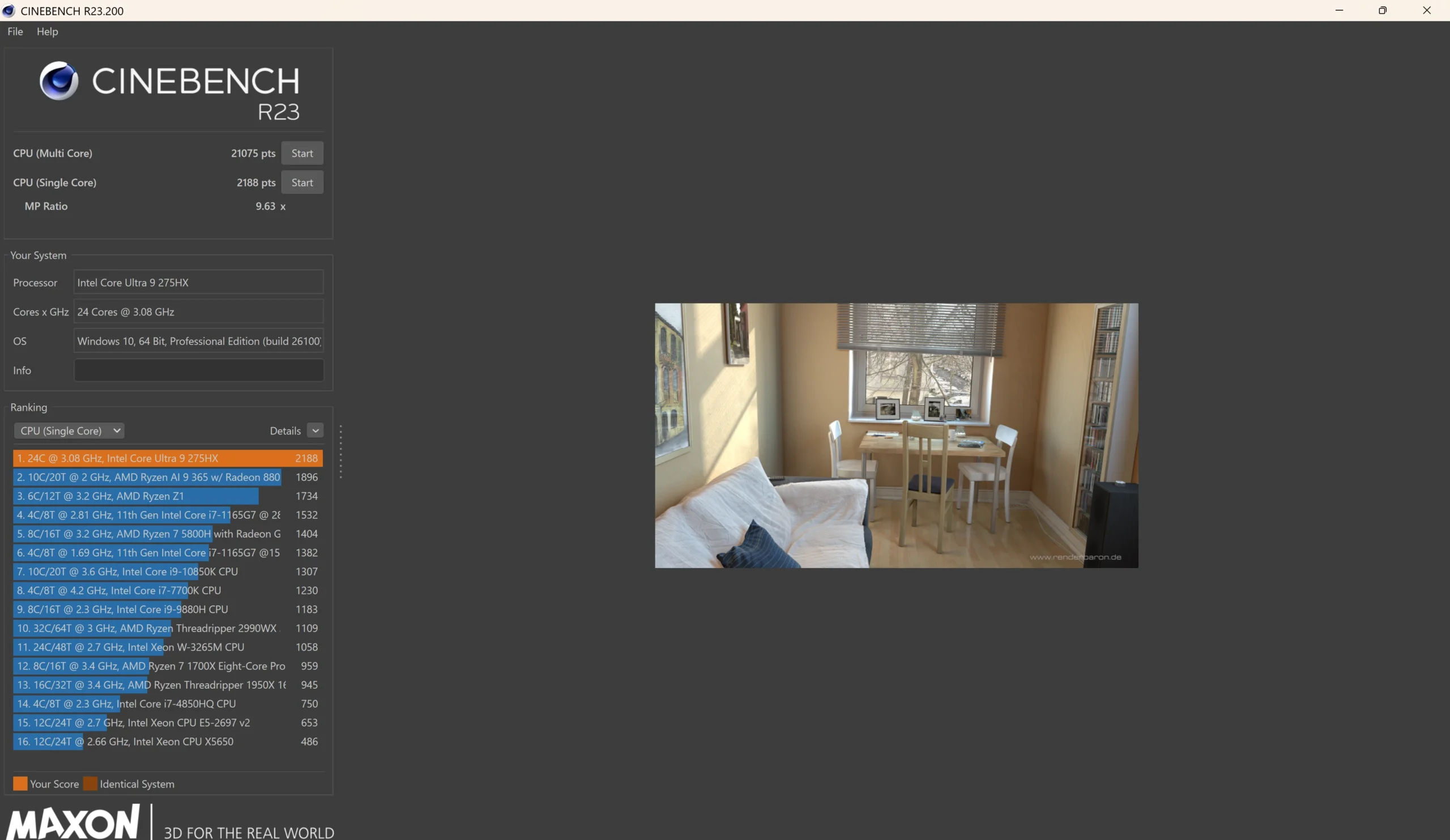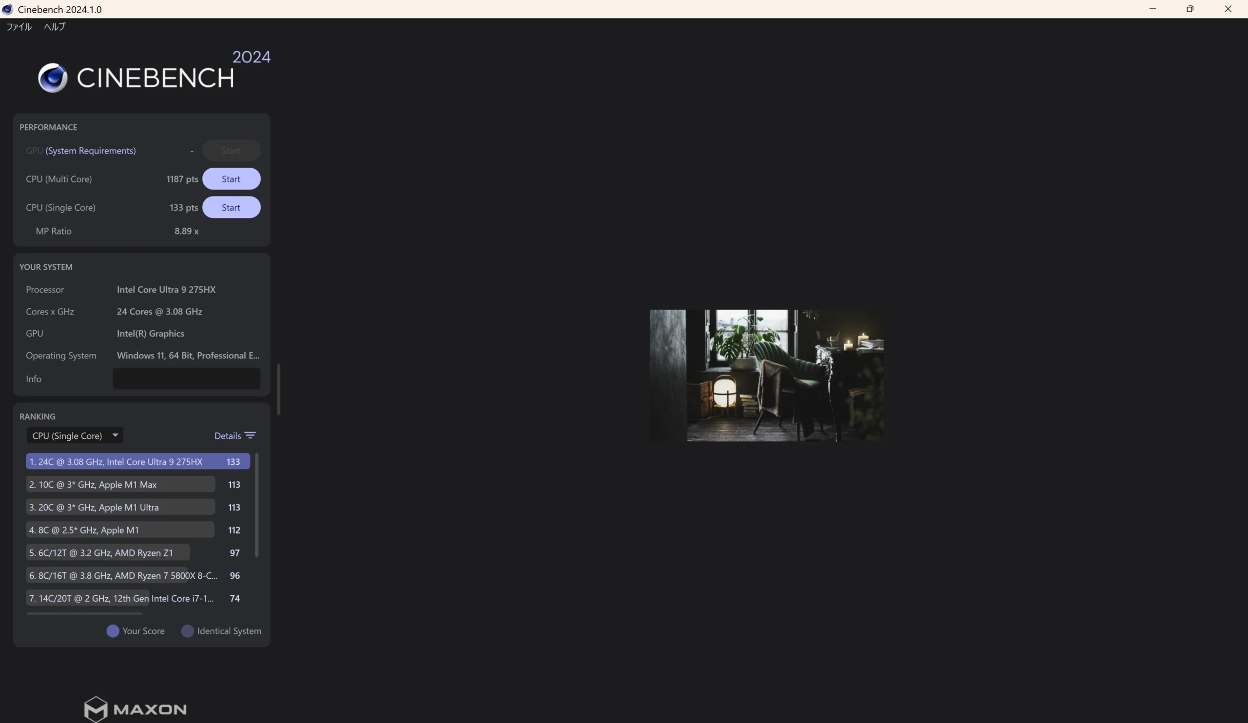 従来版(R23)に比べてシーンの複雑度が上がり、CPUの実際の制作負荷に近い処理性能を測りやすいのが特徴です。そのため、スコアの数値自体はR23よりも小さくなります。