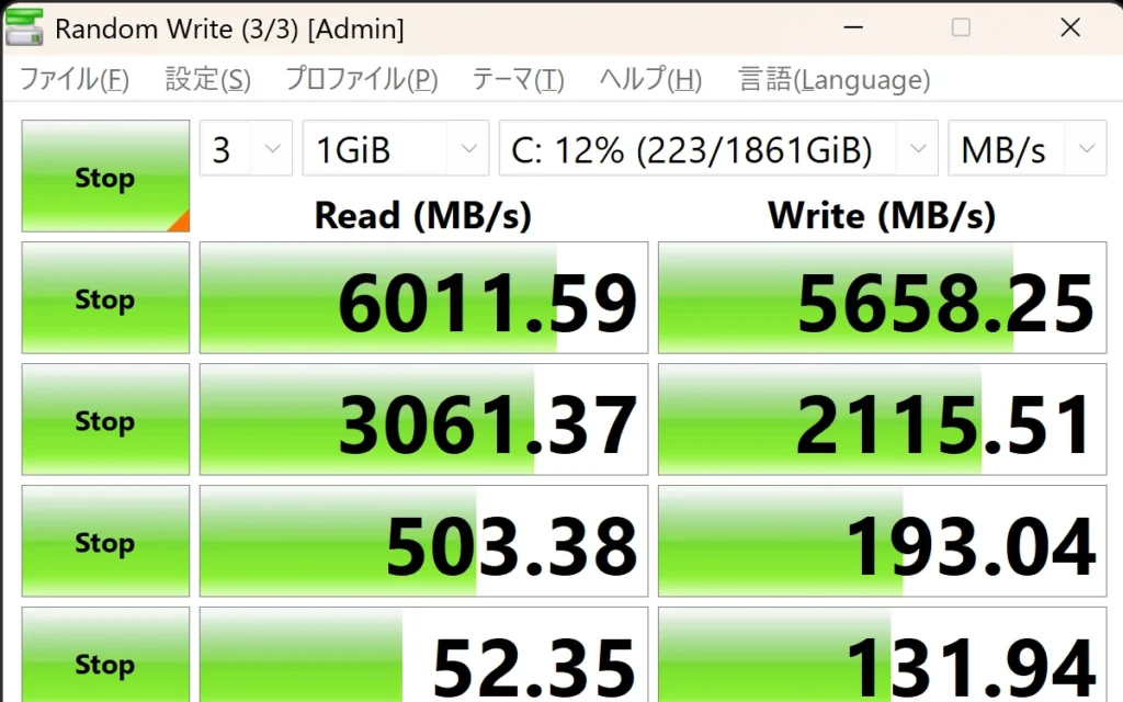 - シーケンシャルライト(書き込み):5,658 MB/s