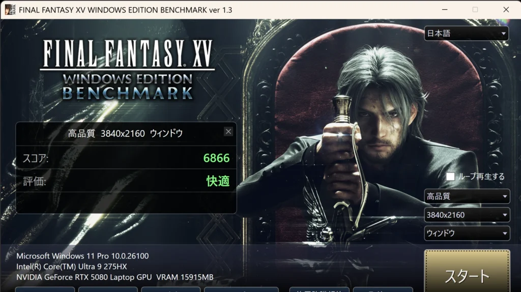 FF14は、描画負荷が中程度で、CPUとGPUのバランスが分かりやすいタイトルです。今回の構成(Core Ultra 9 275HX + RTX 5080 Laptop)では、4Kでも十分に動作余裕があります。
