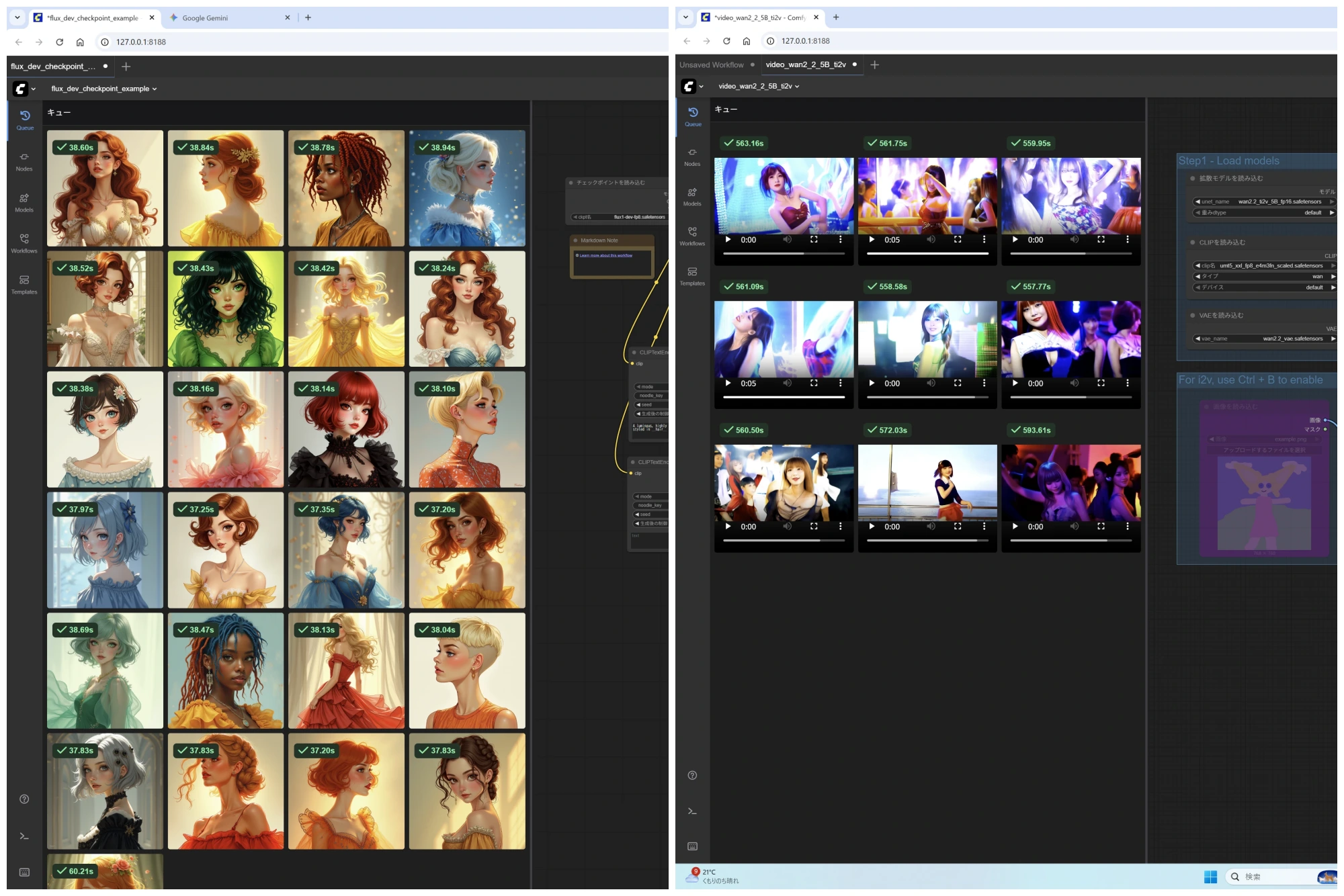 実際に、ComfyUI上でFlux1, WAN2.2(5B)にて画像・動画生成を行ってみた結果、Flux1 での静止画生成は、1枚あたり 約38秒前後。WAN2.2 での 5秒動画生成は、約580秒(9分40秒前後) でした。
