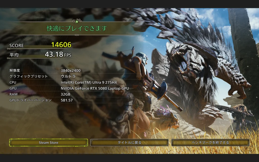 | 4K | ウルトラ | 高 | 最高 | OFF | 14606 | 43.18 |