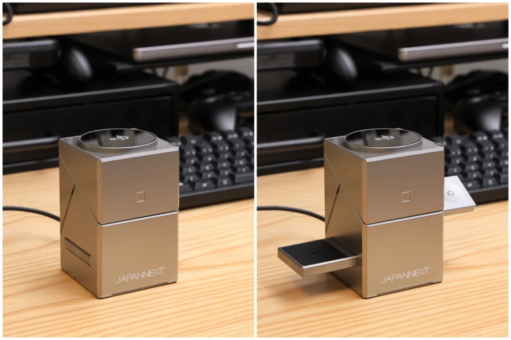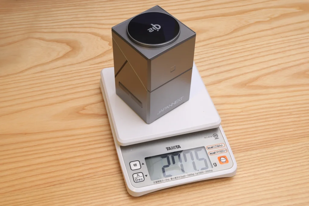 展開されていないときは、シンプルな四角柱。スマホを充電するためのQi2のマグネット部分と、ロゴがあるだけです。非常にシンプルかつスタイリッシュで、どのような環境にも馴染みます。