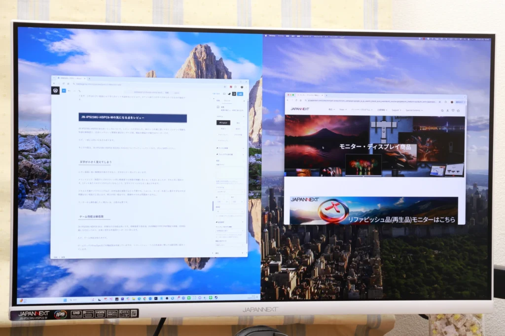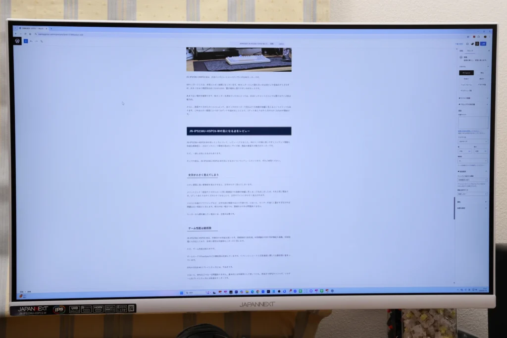 JN-IPS238U-HSPC6-Wのスペックなどについて、簡単に紹介してきました。スペックだけでも本機の特徴はある程度わかりますが、それだけでは使用感などは掴めません。