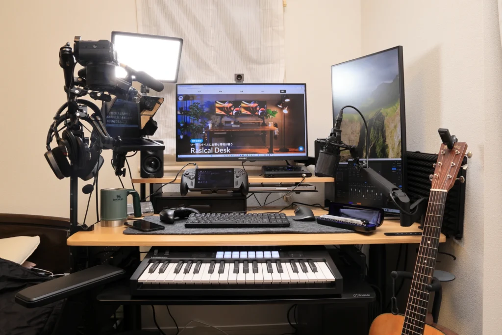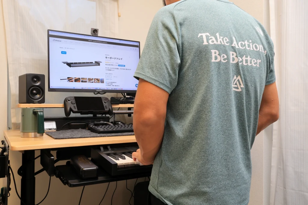 また、Rasical Deskは電動昇降デスクのため、高さを変えて立ってMIDIキーボードを弾くといった使い方も。
