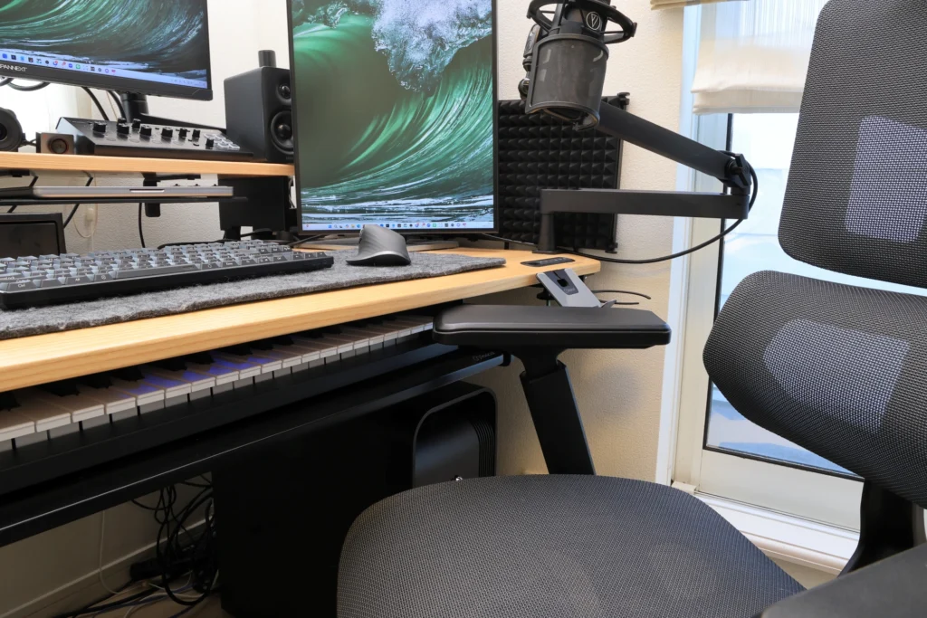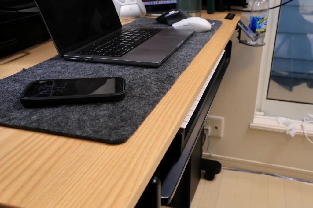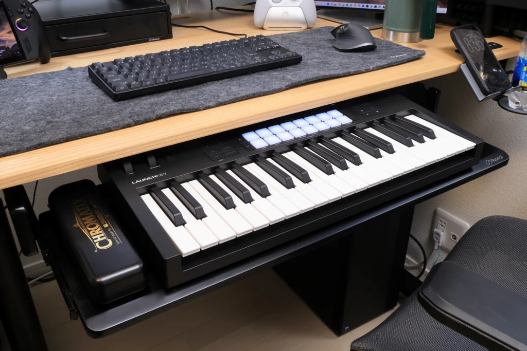 ここまでは一般的なキーボード・マウスをキーボードトレイに収納することを前提にお話ししてきましたが、私の環境では、MIDIキーボードをキーボードトレイに収納しています。