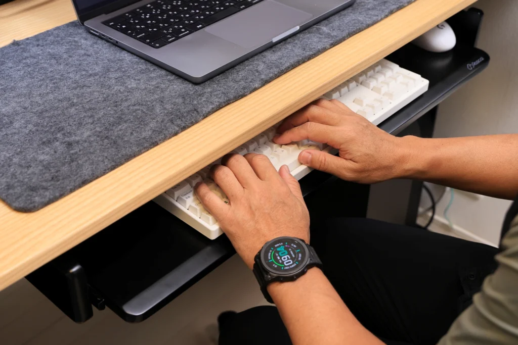 この「目的に応じてベストな位置にできる」点は、固定式キーボードよりも大きな利点。姿勢が崩れがちな長時間の作業でも、無理なく自然なポジションを保ちやすくなります。