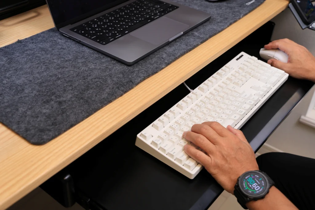 ミニマルな環境や、来客時・配信時など「見せるデスク」を意識する方にもフィット。トレイ上のキーボードが視界に入らなくなるだけでも、心理的なノイズが減り、作業に集中しやすい環境になります。